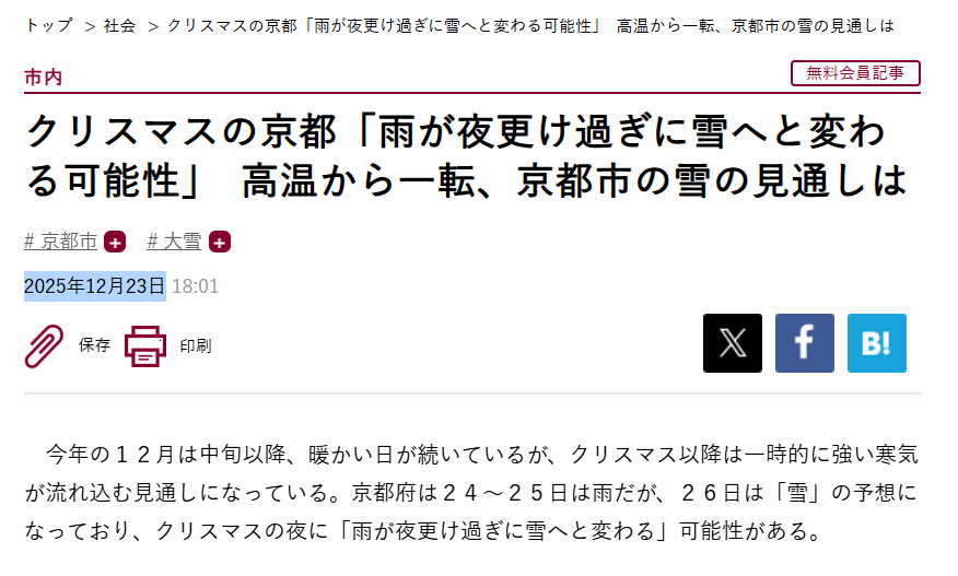 クリスマスの京都「雨が夜更け過ぎに雪へと変わる可能性」 高温から一転、京都市の雪の見通しは…